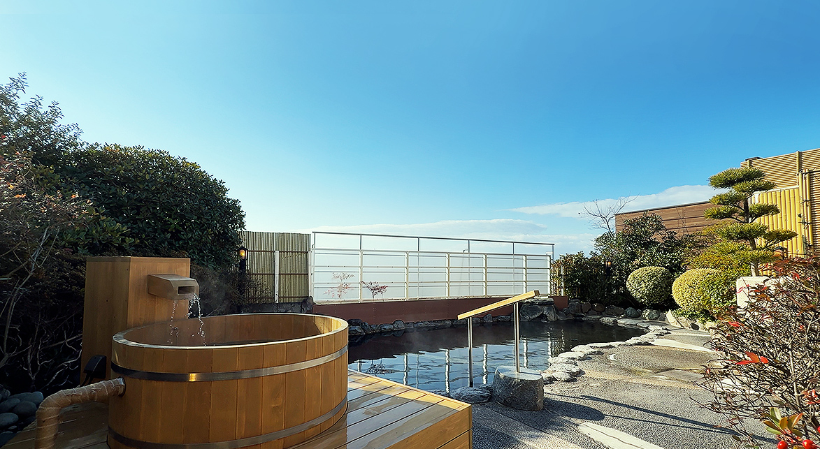 立ちのぼる湯けむりの向こうに遠く南には松山城、北には石鎚山を眺めながら伝統の湯にゆっくりと身をゆだね、心静かなひとときをお過ごしいただけます。