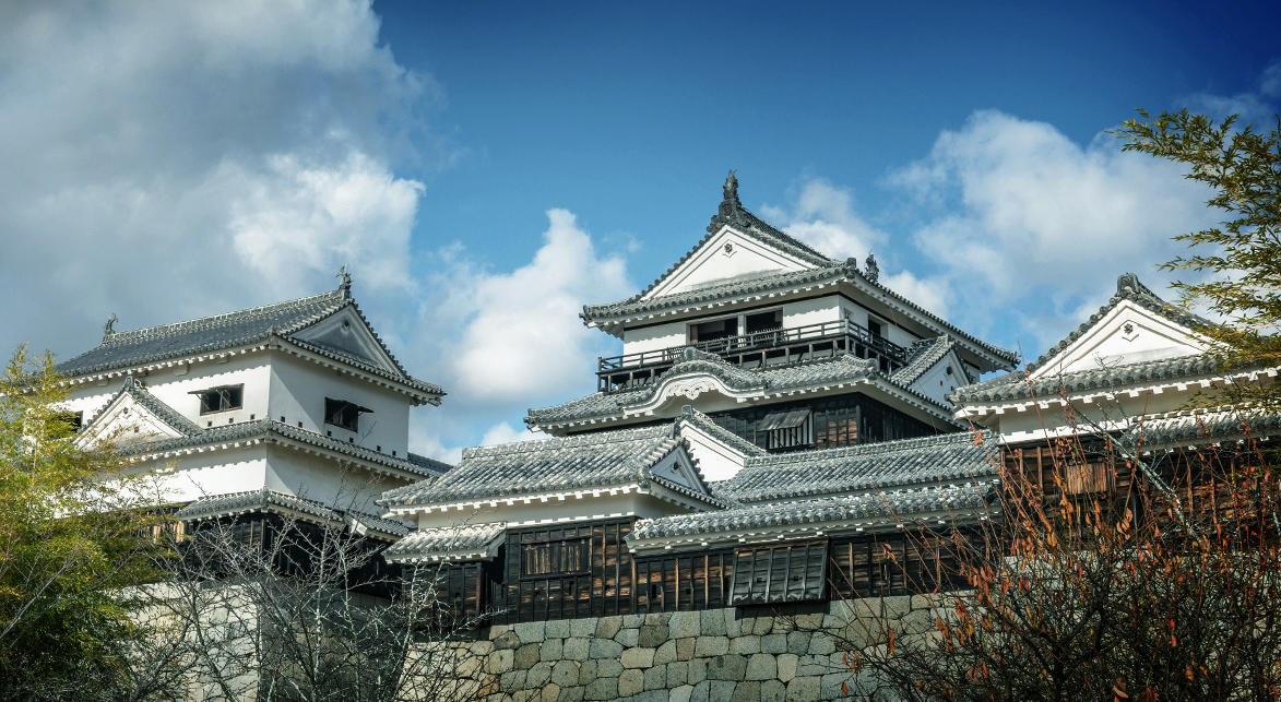 茶玻瑠から車で約10分、路面電車では15分ほどの場所に、松山の象徴「松山城」がそびえています。山頂の天守へはロープウェイやリフトで向かうことができ、城下を一望する景色は、昼は穏やかな街並み、夜は美しい夜景と、訪れる人を魅了します。