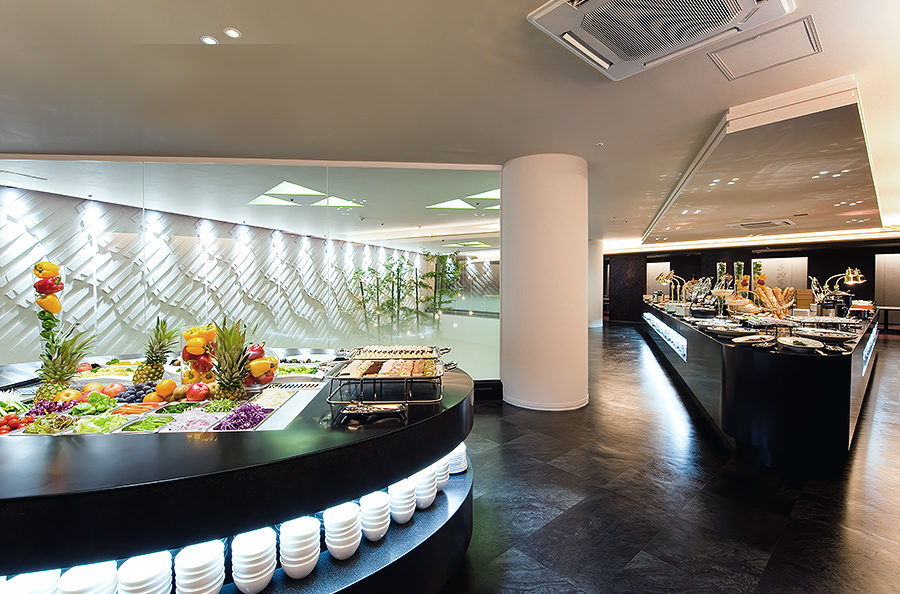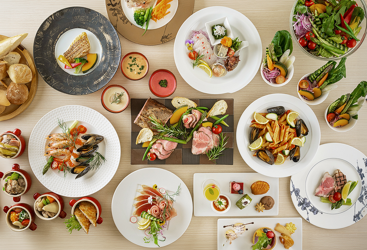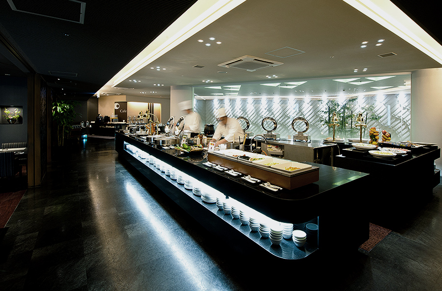 ライブキッチンでは、当ホテルのシェフがお客様の目の前で調理し出来立てのお料理をご提供、季節のフルーツやショコラ、クリームを使った華やかなデザートをご用意しております。オードブル、サラダ、デザートをご自由に楽しんでいただけます。