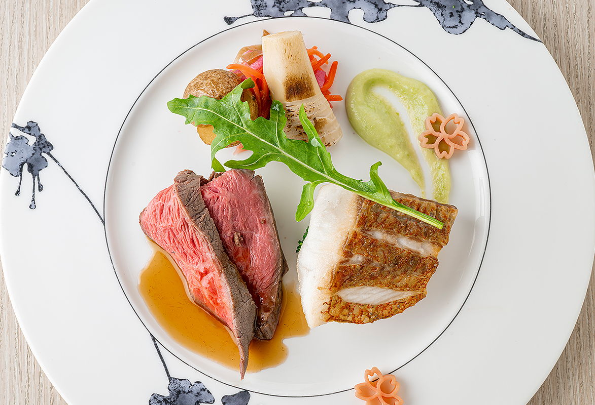 ベーシックのお料理にメインディッシュ愛媛県産真鯛、愛媛県産牛を使用したプレミアムな1品をご用意。