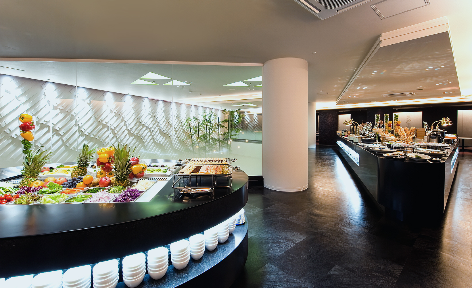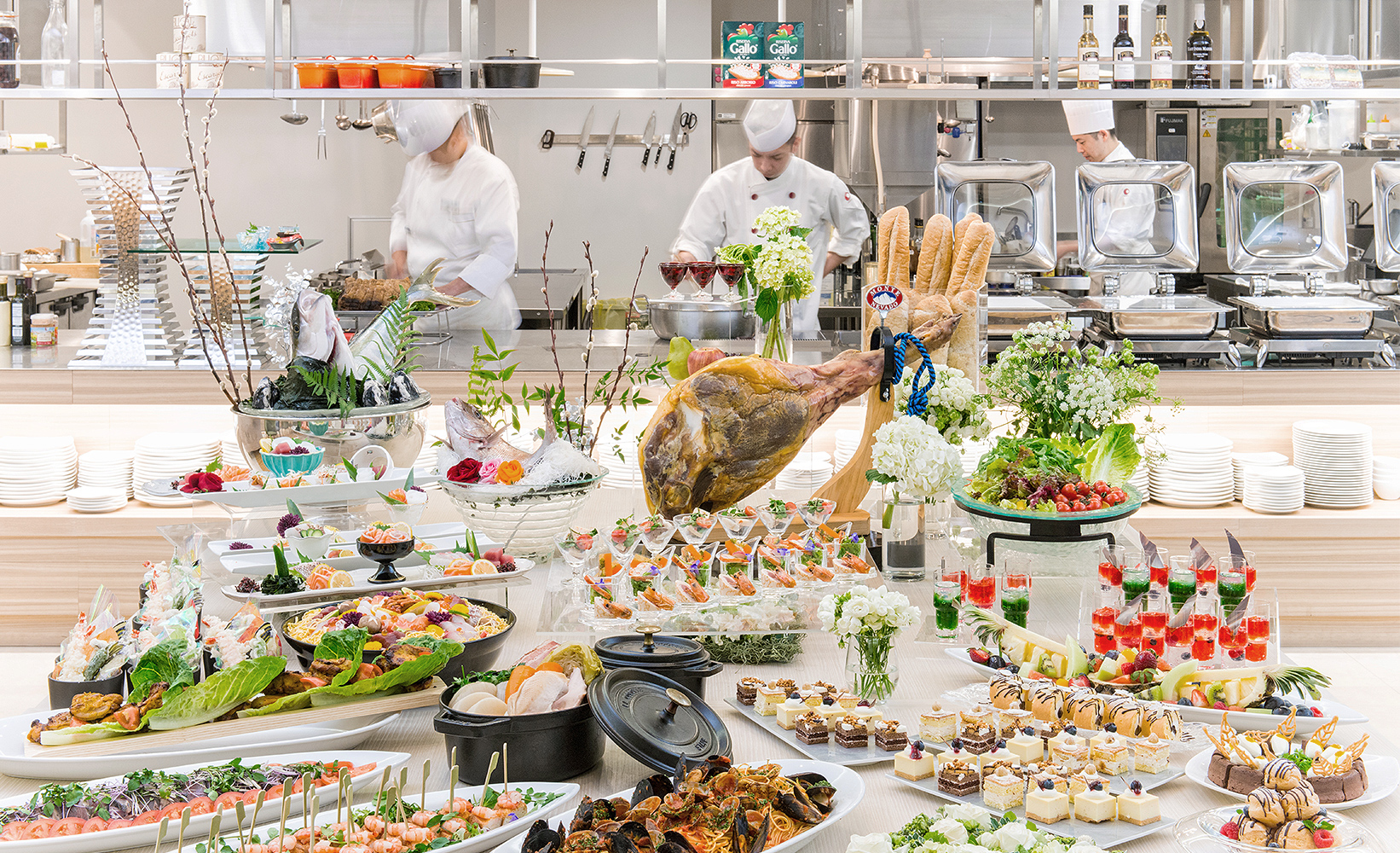 ライブキッチンでは、当ホテルのシェフがお客様の目の前で調理し出来立てのお料理をご提供、季節のフルーツやショコラ、クリームを使った華やかなデザートをご用意しております。オードブル、サラダ、デザートをご自由に楽しんでいただけます。