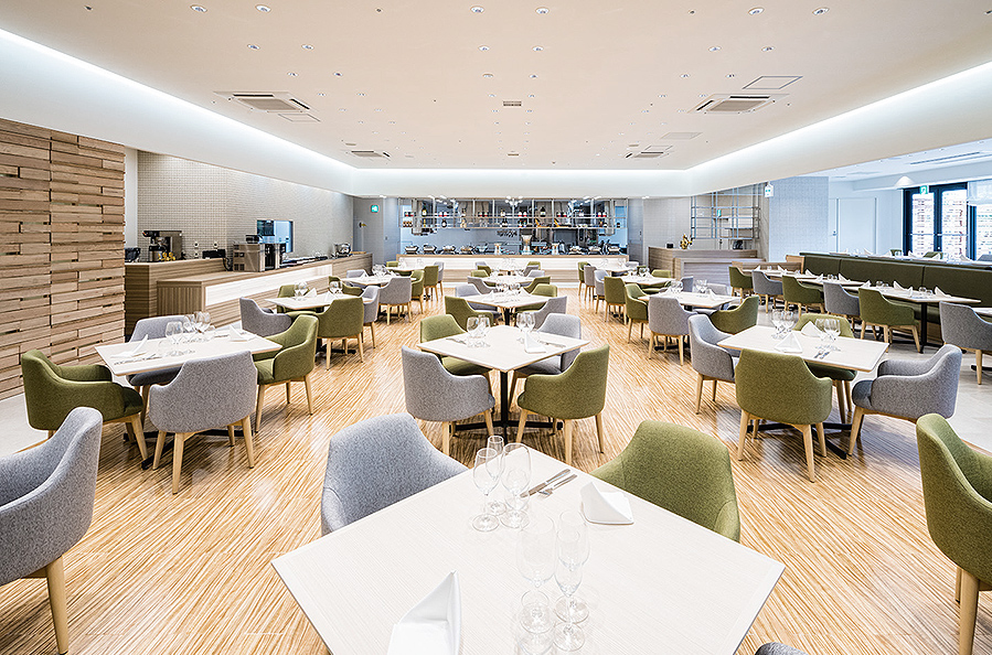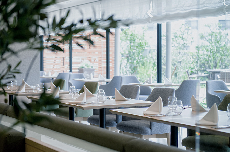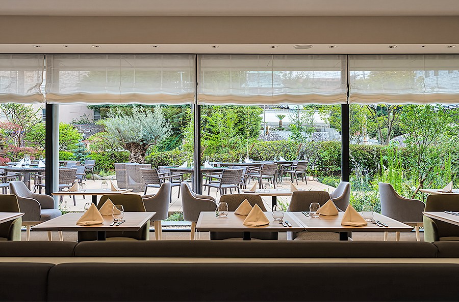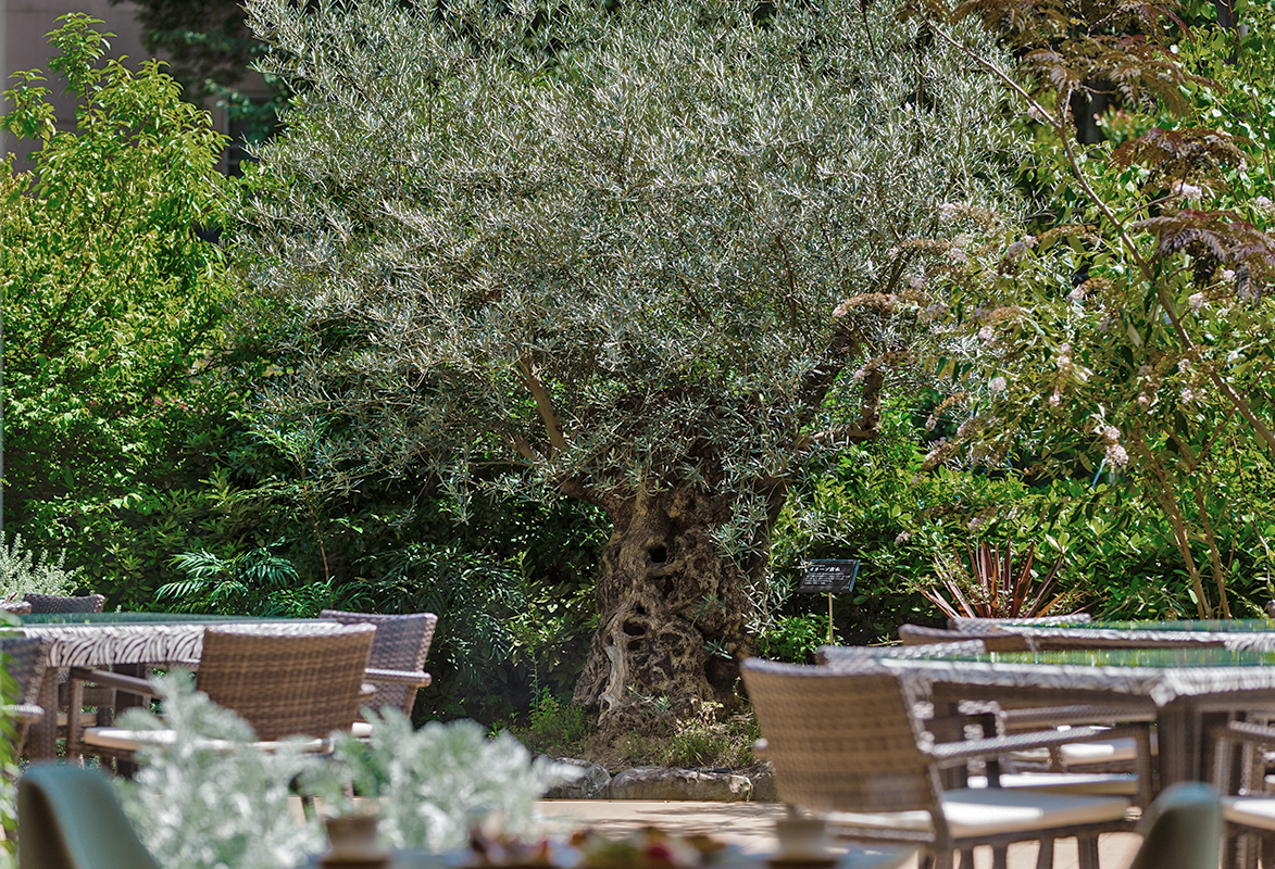 メインダイニング「ラ・キュイジーヌ・ジャポネーズ玻璃」は樹齢260年のオリーブとホワイトガーデンを隣接した開放感あふれる空間。