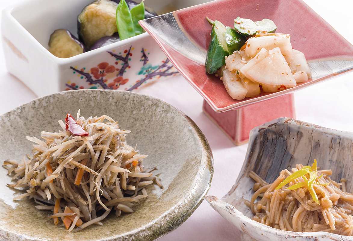 しらすおろし / オクラ胡麻和え / 明太子 / 蒲鉾 / じゃこ天 / おから煮 / ひじき煮