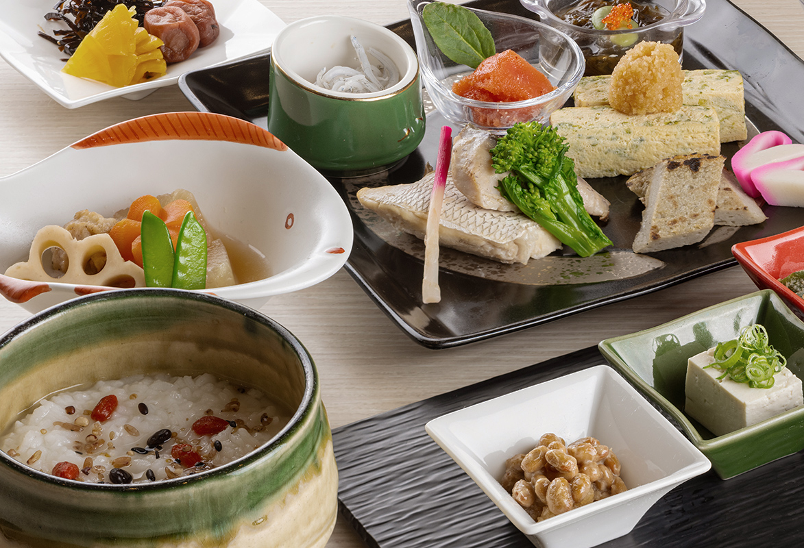 納豆 / あかもく または、もずく / 冷奴 / 温玉 / 薬膳粥 / 伊予のお味噌汁 白ご飯