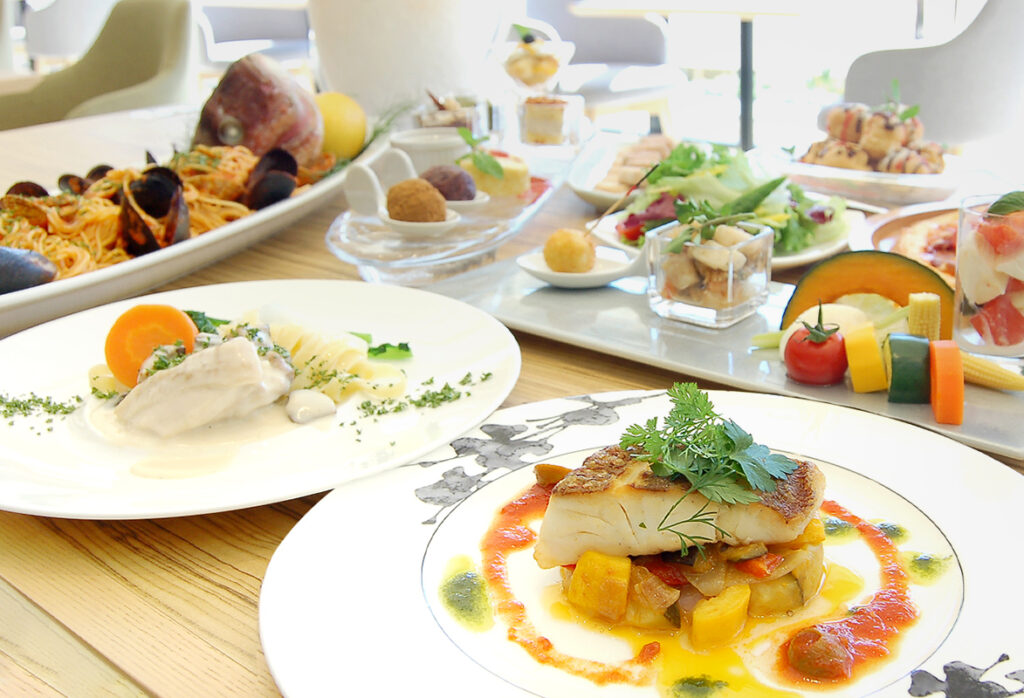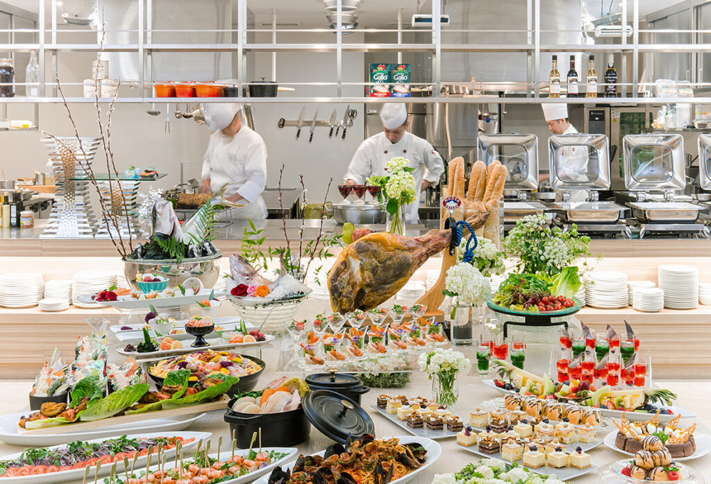 シェフが目の前で調理するオープンキッチンスタイルで、オードブル・サラダ・デザートなどブッフェから自由に楽しめます。
