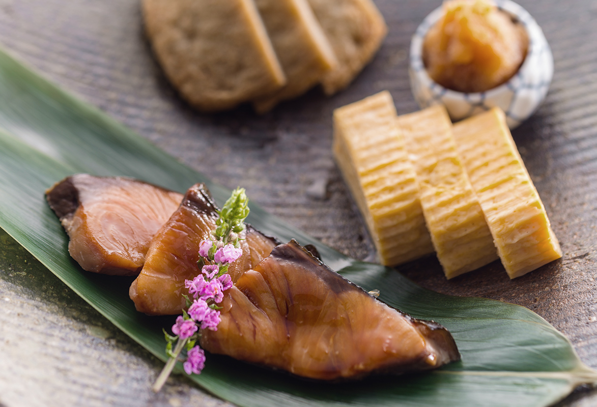 焼き魚(鯖またはサワラまたは鯛かま) / 漬物(つぼ漬け・シバ漬け・梅干し・昆布佃煮・胡瓜ピクルス)