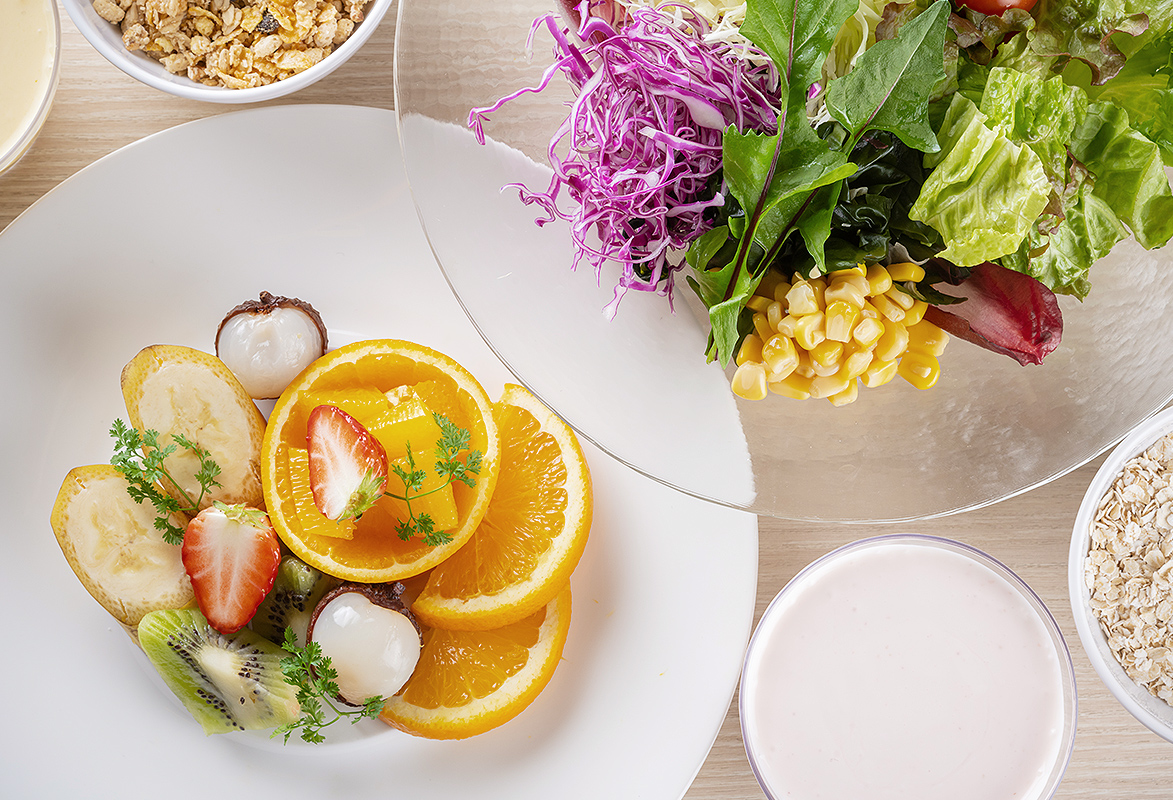 蒸しごぼう・スパ・中華・ゆで卵) / フルーツ(バナナ・オレンジ・ライチ・キュウイ) / シリアル / ヨーグルト