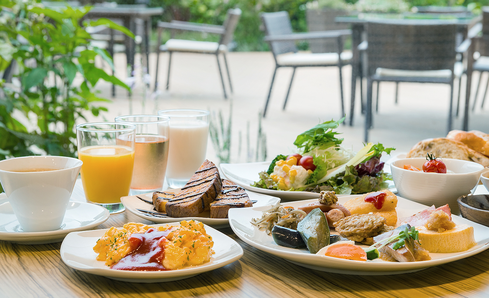朝の陽ざしが差し込むガーデンを眺めながら、やさしい光とともに始まる贅沢なモーニングタイムをお過ごしください。