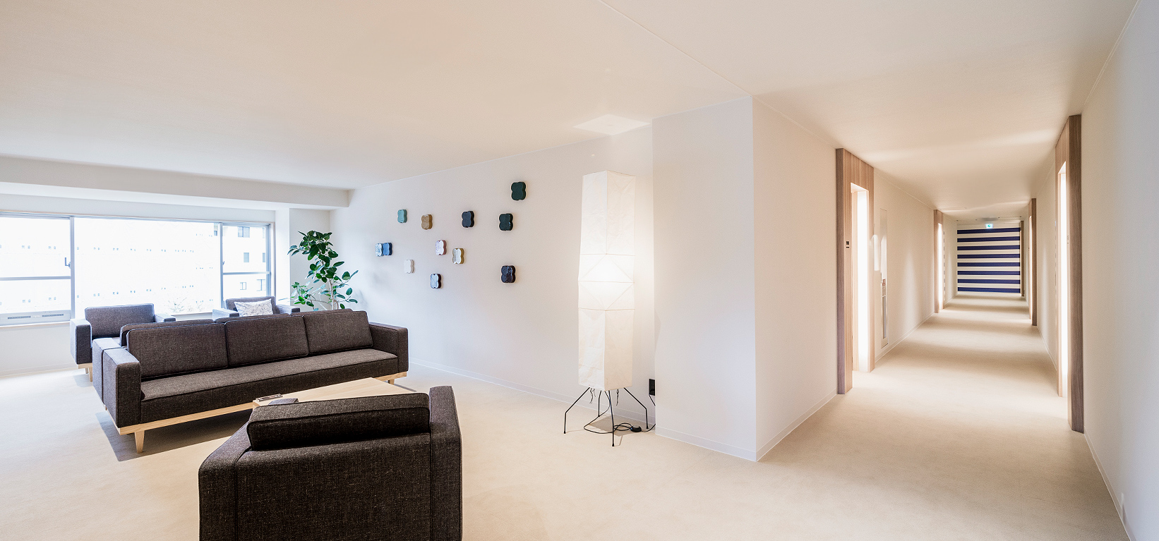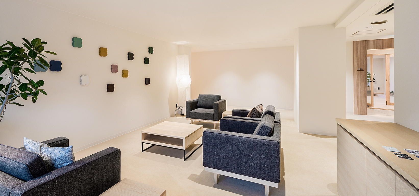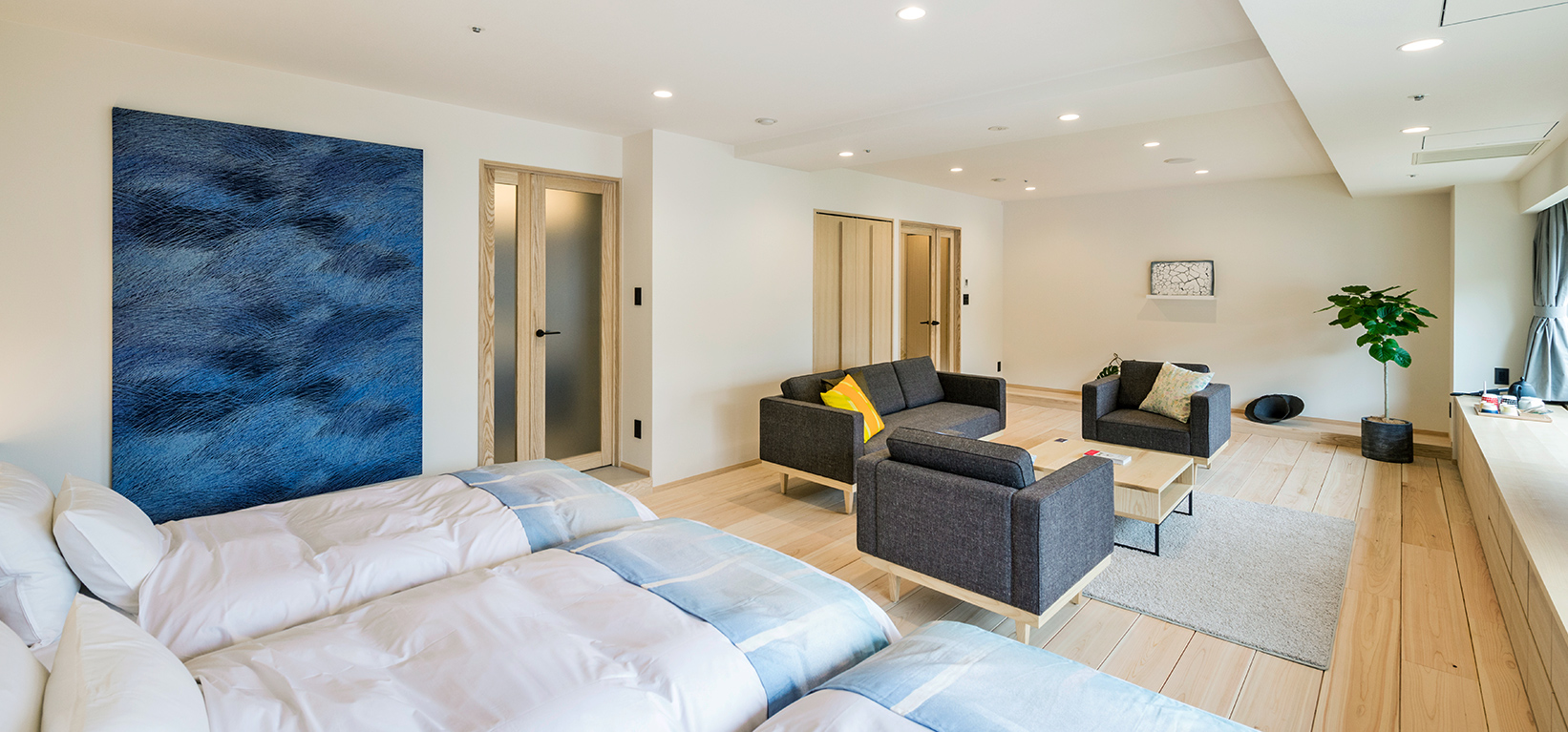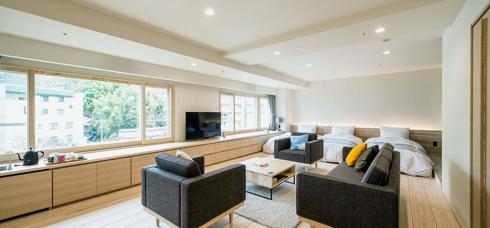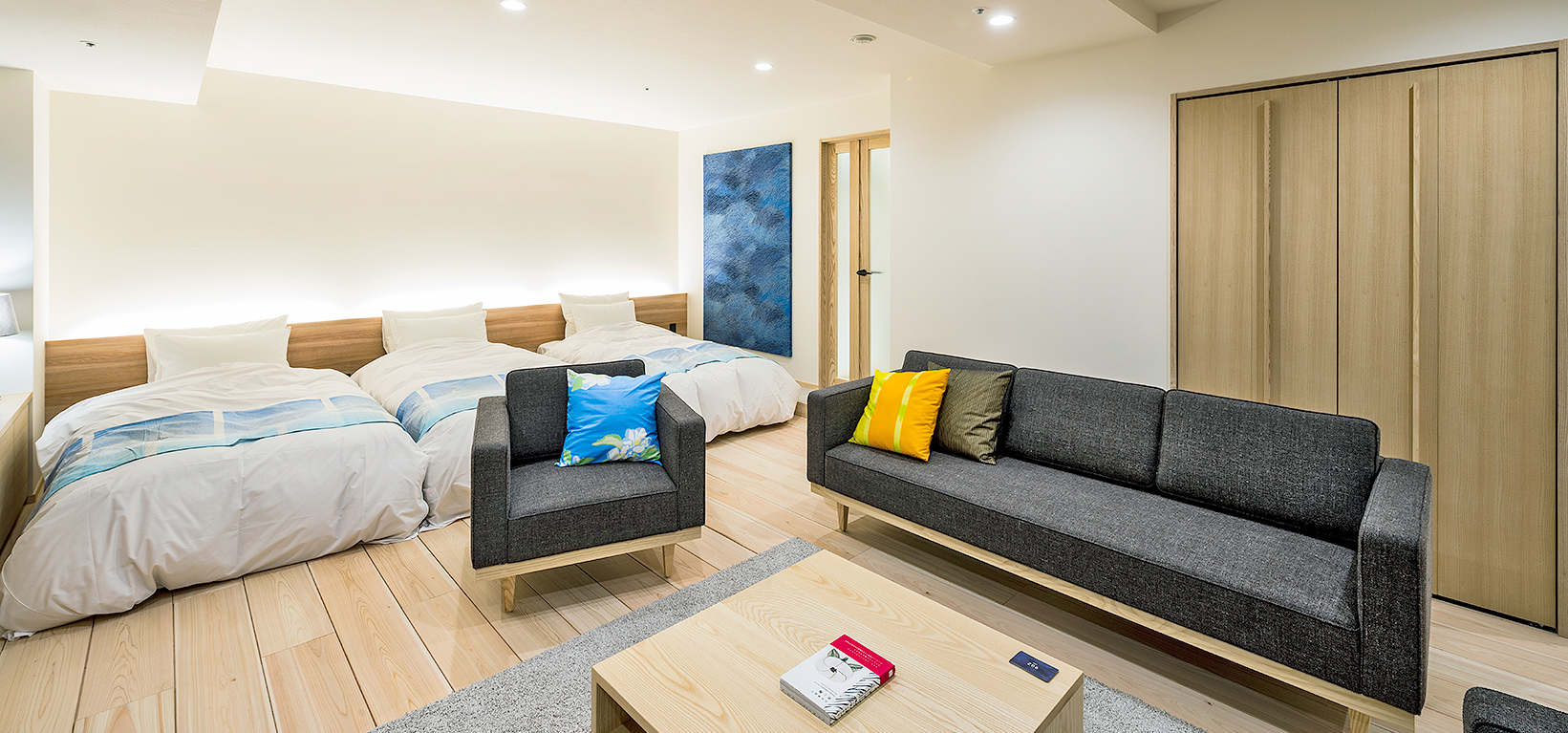 エグゼクティブルームは、愛媛県砥部町出身のアーティストである石本藤雄氏の手によりプロデュース。北欧インテリアに囲まれたシンプルで機能的なデザインの中に、床材や家具には愛媛県産材が多用されています。