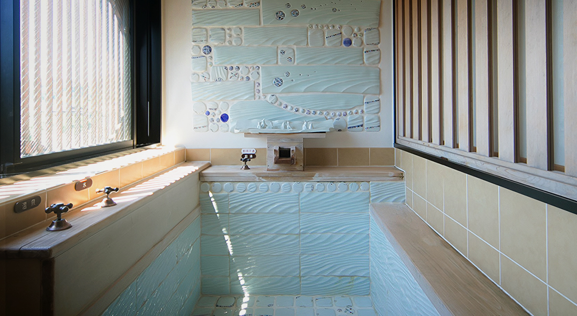 淡い水色の砥部焼タイルに刻まれた波模様が、川の流れのように静かに心を癒してくれる浴室。