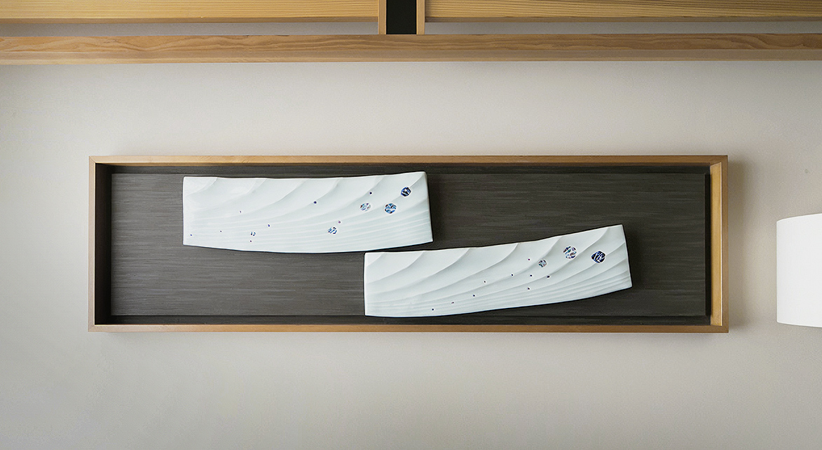 室内には砥部焼が随所に用いられ、川のせせらぎを思わせる流麗さと力強さが調和し、落ち着きある雰囲気を漂わせます。